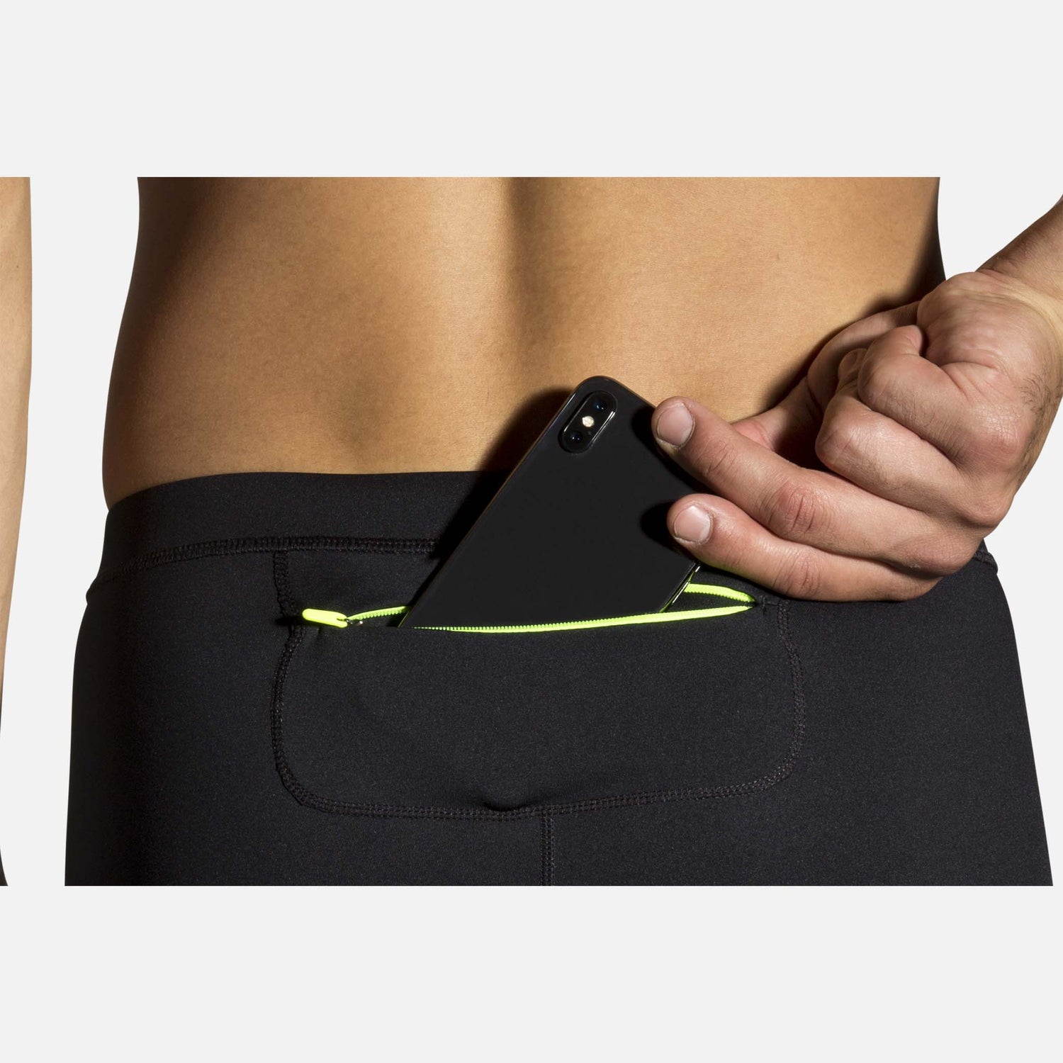 The 3M Scotchlite Carbon Black Stretch reflective detailing on the Brooks Carbonite running pant in critical movement areas helps drivers recognize you as a runner on the move from up to 600 feet away. The fabric is both insulating and breathable to keep you comfortable without getting too hot. The zippered back pocket protects your phone or other items.