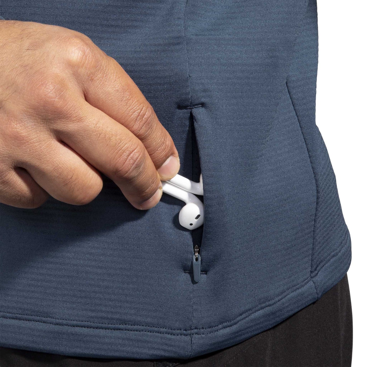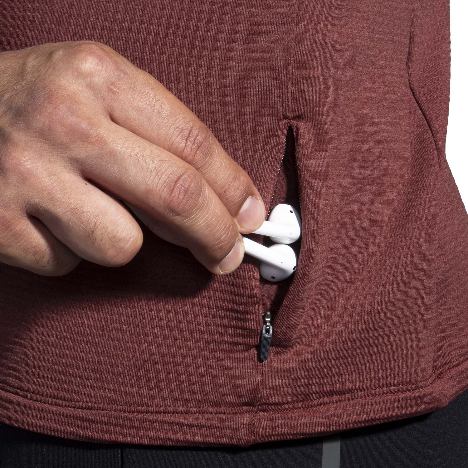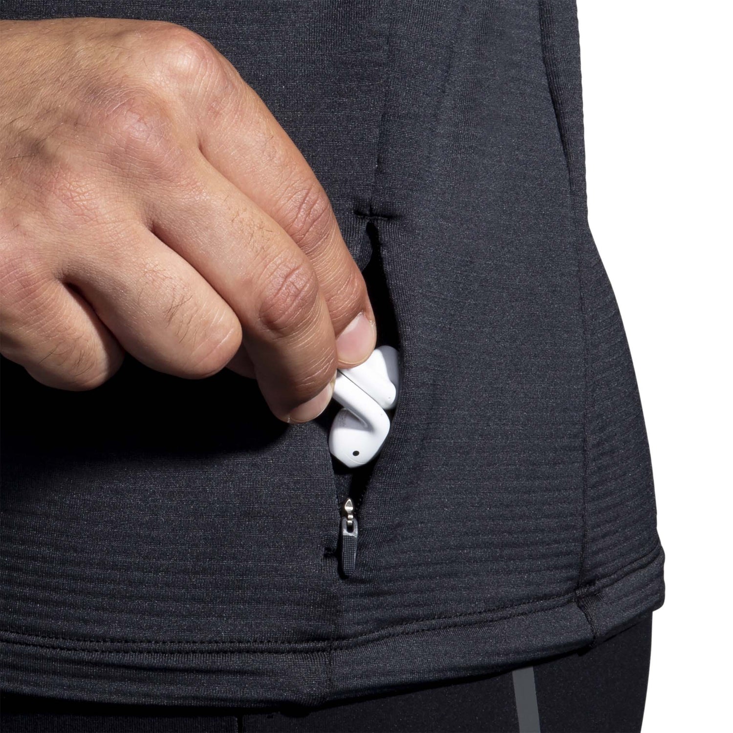 Zippered pocket at hem.
