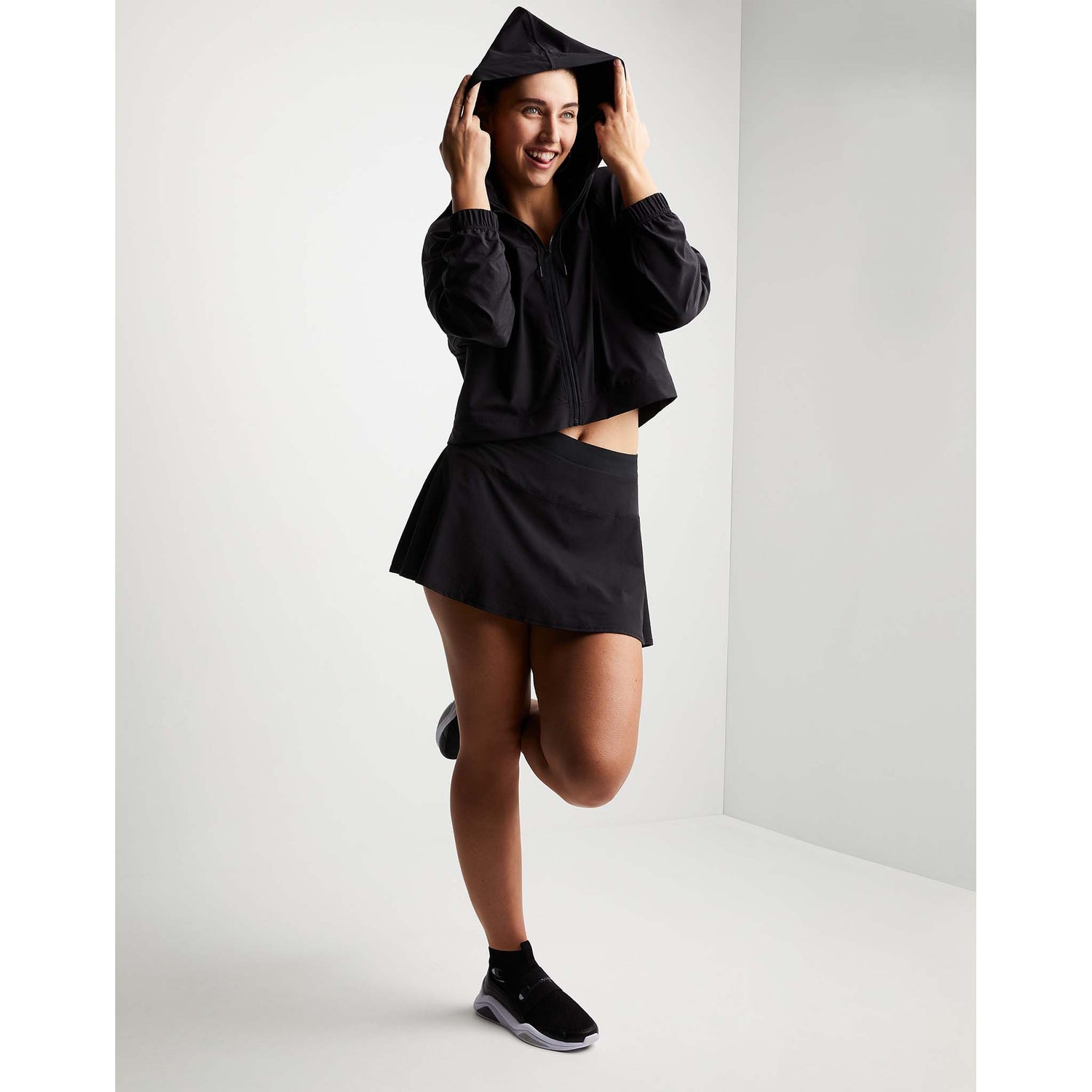 A lightweight woven jacket with a front zipper, a seasonal essential. Designed to be versatile, it's ideal for warming up or relaxing. It features side front pockets, a classic drawstring hood with tabs to keep cords in place, and targeted ventilation with mesh inserts on the sleeves and front of the body for optimal comfort.