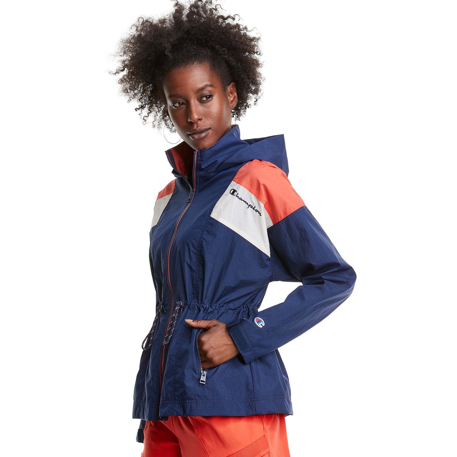 Keep the elements at bay in this lightweight, water- and wind-resistant nylon jacket. Featuring a flattering cinched waist with drawcords, trendy details in contrasting colors, zippered side pockets for storage and a fold-down hood with Velcro closure ®, this full-zip jacket will protect you whatever the weather. The Champion crest on the nape of the neck and the script logo embroidered on the left chest reinforce the athletic vibe.
