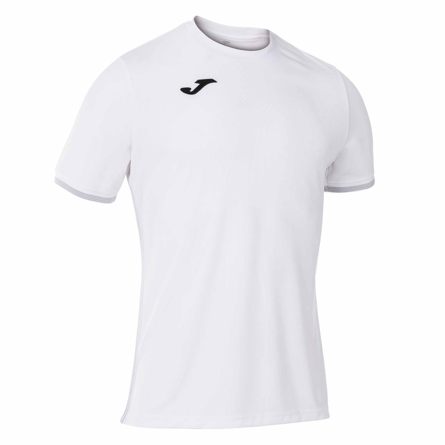 Short sleeve jersey with ribbed collar and cuffs. Ribbed stripe rib. Embroidered "J" logo on front.