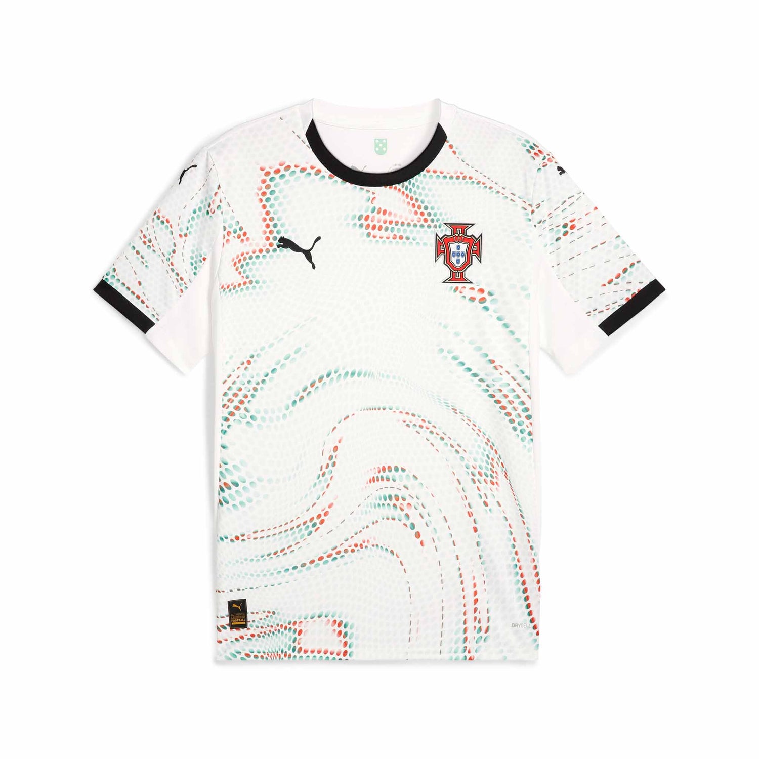 The Puma Portugal FPF Away 2025 Jersey celebrates the vibrant spirit of modern Portugal with bold graphics and red and green accents that symbolize the fusion of art, technology, and soccer. Designed for fans, this jersey pairs the match-worn look with a casual silhouette and premium materials, making it ideal for game day or everyday wear. Crafted with sustainability in mind, it features 100% recycled polyester through PUMA’s RE:FIBRE program and dryCELL sweat-wicking technology to keep you cool and comfortable.