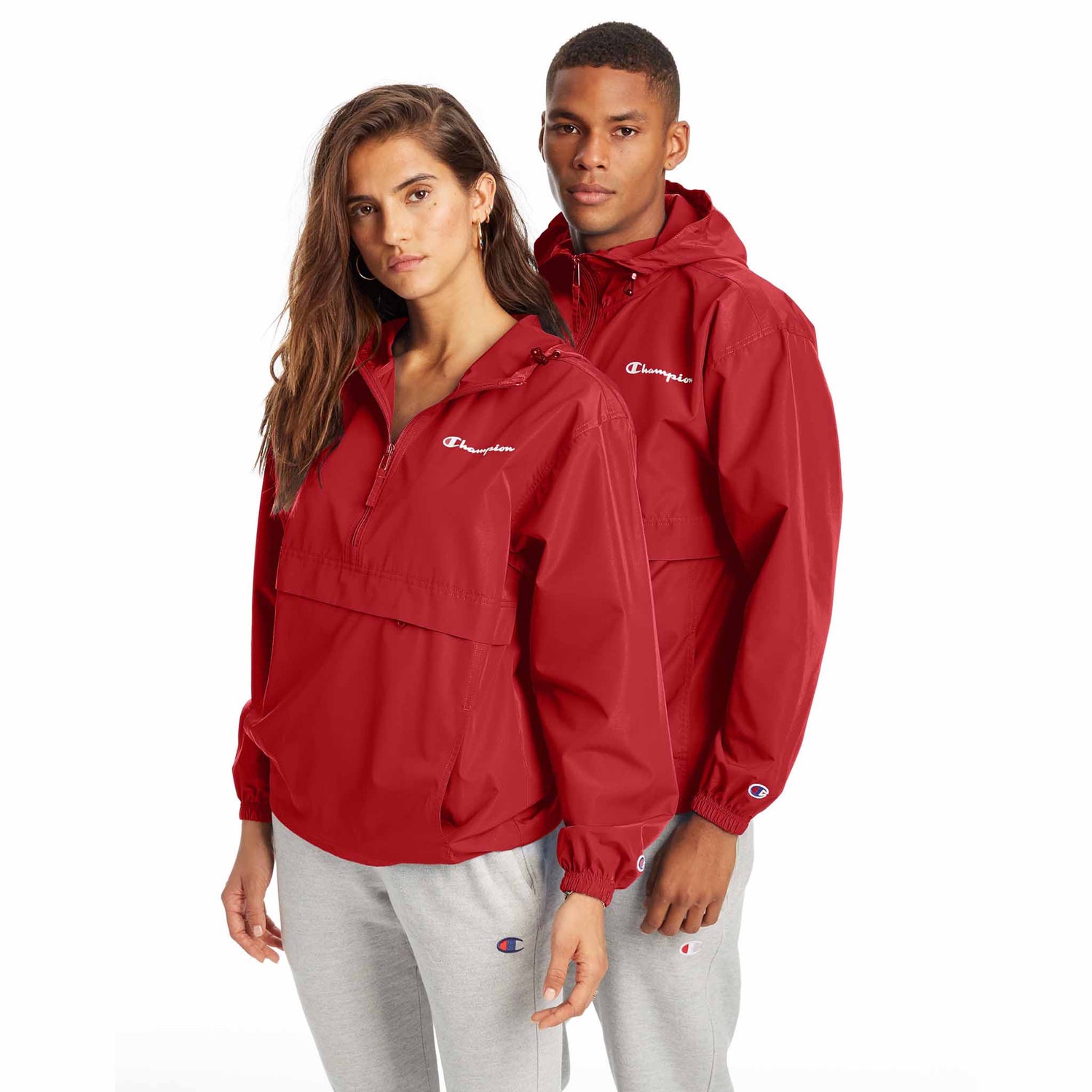Manteaux de pluie coupe-vent Champion Stadium Packable avec logo script pour homme et femme.